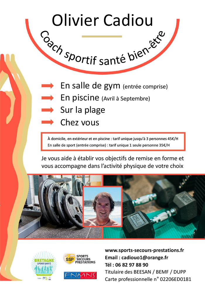 Je vous accompagne et assure votre suivi Sport Santé Bien être, répondant au mieux à vos objectifs aussi variés que la reprise d'activité physique, la perte de poids, le renforcement musculaire, la préparation physique spécifique et l'apprentissage et perfectionnement natation.